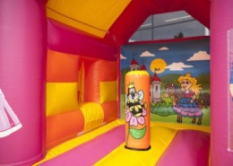 Dit midi multifun prinses springkussen is een leuk springkussen met leuke thema prints en mooie kleuren. Het springkussen is voorzien van een obstakel op het springvlak en ook heeft dit springkussen aan de zijkant een glijbaan.
